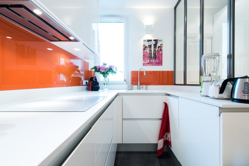 Cette jolie cuisine Armony Cucine à été aménagée en « U » pour offrir un maximum de fonctionnalités dans un espace en longueur. Les portes des placards, sans poignées, s’ouvrent grâce à un système de push-pull et par un système de poignée de type « gorge » très discret. Le coin repas, conçu pour accueillir plus de quatre personnes, semble émerger d’un meuble de rangement sur-mesure, dans le même esprit que la cuisine. Ce meuble toute hauteur est aménagé de niches de petite profondeur dans la même finition blanc laqué que la cuisine.