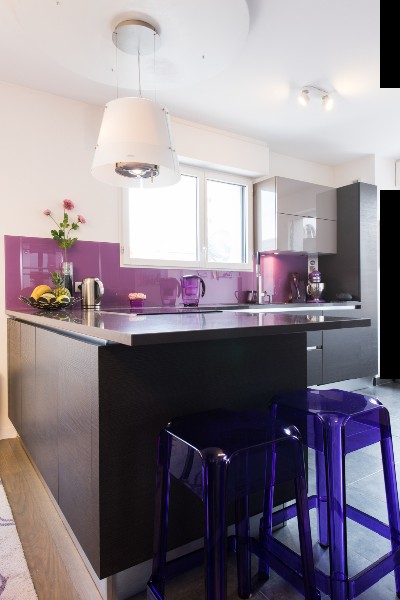 Conçue dans un programme neuf, cette cuisine familiale de 20 m² se compose de deux zones : l’une pour les préparations culinaires et la cuisson, l’autre pour le lavage des aliments. Sa particularité : elle accueille pas moins de quatre coins repas en une seule cuisine : une table sur la terrasse accessible par la cuisine, une table d’angle en verre laqué découpé sur-mesure pour les plus jeunes, une extrémité du plan de travail, et enfin la table de salle à manger.Le choix de matériaux transparent et réfléchissants tels que le verre et le plexiglas allège encore cet ensemble baigné de lumière. Le disque au plafond permet de masquer le branchement éléctrique de la hotte.