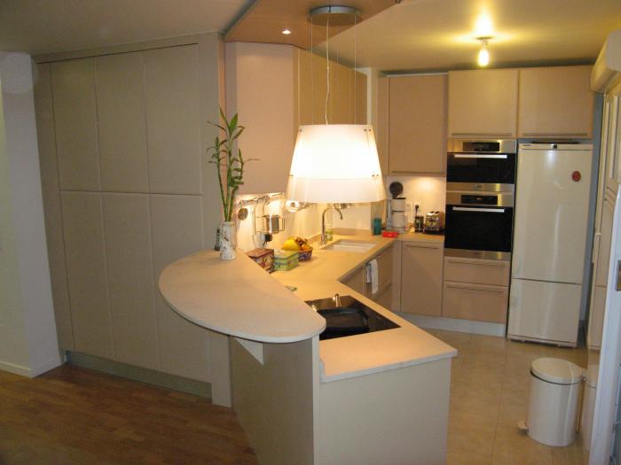 Cet espace cuisine, conçu dans une grande pièce à vivre, comporte des meubles laqués en finition gaufré pour donner du relief à l’ensemble. Donnant sur le salon, le bar surmonté d’une hotte aux airs de luminaire, permet une transition douce entre les espaces salon et cuisine. Il a aussi pour fonction de cacher la partie dite « technique » de la cuisine. Un plan de travail en pierre de synthèse, choisi pour sa solidité et sa durabilité, confère à l’ensemble une ligne pure et facilite le nettoyage. Enfin, des placards dans les mêmes finitions ont été créés ont été réalisés sur-mesure afin d’optimiser le rangement.