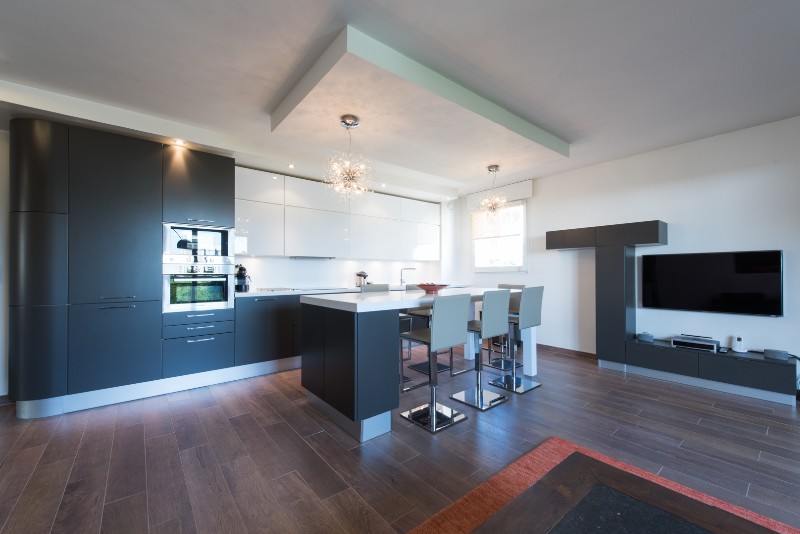 Un îlot s’élève au centre de la cuisine et fait office de table à manger, les sièges de bar qui l’agrémentent ont une finition inox et cuir.