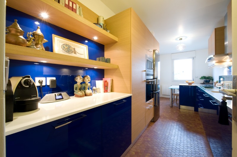 Beaucoup de contraste dans cette cuisine mariant les teintes bleu outremer et inox, sur un sol d’origine en tomettes de terre cuite. On y rencontre différent matériaux qui se mélangent avec harmonie : inox, quartz, verre laqué (table repas) et bois naturel (chêne). Le retour comptoir a été pensé pour offrir un coin repas pour quatre personnes, toujours dans l’esprit gain de place. On accède à cette pièce depuis l’entrée mais aussi depuis le séjour, c’est donc pièce à vivre familiale très fréquentée. Dès l’entrée une partie est prévue pour accueillir courses et courrier.