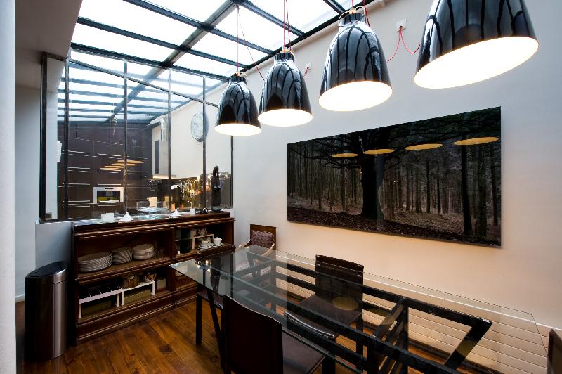 Cette cuisine d’inspiration industrielle bénéficie de la lumière naturelle d’une magnifique verrière, qui se prolonge sur la partie salle-à-manger.