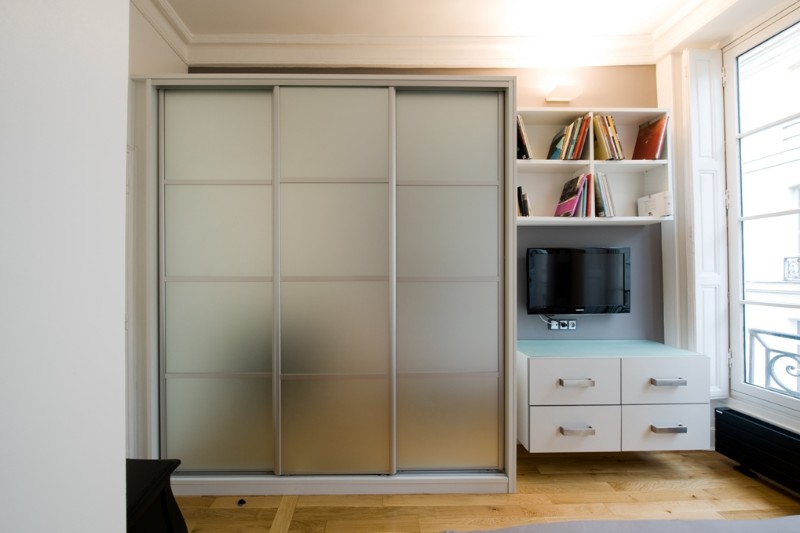 Le verre dépoli des portes coulissantes donnent à ce dressing une touche très contemporaine, et l’uniformise avec le style global de la chambre.