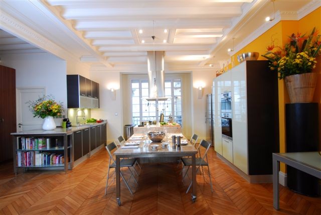 Cette cuisine aux finitions Wengé accueille une table à manger dans la continuité de l'îlot en granit poli.