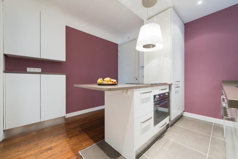Dans cette petite cuisine, une hotte au design atypique surplombe la table de cuisson. Le réfrigérateur est encastré dans dans un meuble-colonne pour plus de discrétion.
