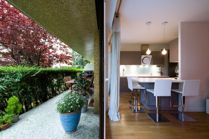 Les meubles comportent tous des façades sans poignées, avec un système de gorges profilées intégrées en inox. Un des deux plans de travail se prolonge en péninsule sur un linéaire de meuble bas afin de créer un espace table à manger. Le rangement intégral sur mesure du sol au plafond intègre des spots LED sous les meubles hauts. Des blocs multiprises d’angle sont également placés entre les meubles haut et le plan de travail pour optimiser l’utilisation de petit électroménager. Enfin, la crédence en verre trempé facilite l’entretien et apporte une touche d’esthétisme supplémentaire à la cuisine.