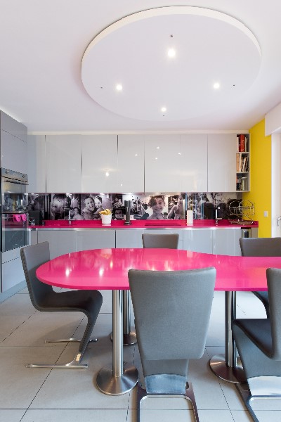 Vive les coloris flashy ! Cette grande cuisine ouverte et agencée en "L" intègre une table à manger sur-mesure et de belles dimensions. Le teinte gris moyen s'accorde parfaitement aux surfaces jaune et fuschia, et conserve la belle luminosité de la pièce. La crédence (en millefeuille de verre trempé) complète l'originalité et la convivialité de cette pièce à vivre : un composite de belles photos de famille y est intégré pour en profiter au quotidien.