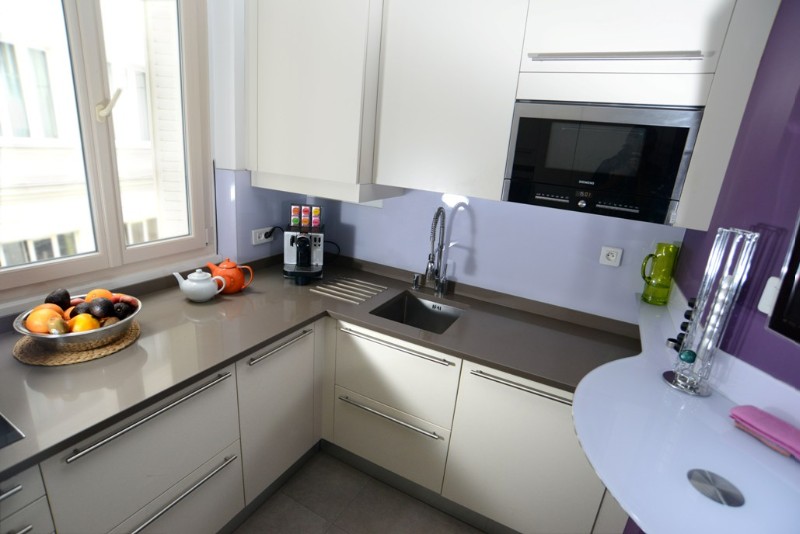 Située au niveau de l’entrée d’un appartement, cette astucieuse cuisine a été conçue en respectant le triangle d’activité d’une cuisine. Le cheminement du propre et du sale est également respecté, puisque de l’autre côté de la cloison est aménagée une lingerie ainsi qu’un WC avec lave-mains. Cette cloison sert de support à la console du coin repas en verre satiné. Toujours dans la recherche de l’encombrement minimal, la fenêtre est également oscillo-battante.