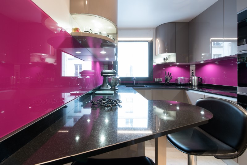 Cette cuisine en U est très fonctionnelle grâce à ses rangements de grande contenance tout en étant gain de place : tiroir grande profondeur, tiroir casserolier, système magic corner dans les meubles d’angle. Le gros éléctroménager est principalement intégré dans les meubles-colonne pour un design aux lignes pures renforcé par des façades sans poignées (remplacées par un système de gorge profilée en inox). La crédence en verre trempé d'un rose magenta intense vient sublimer l'ensemble.