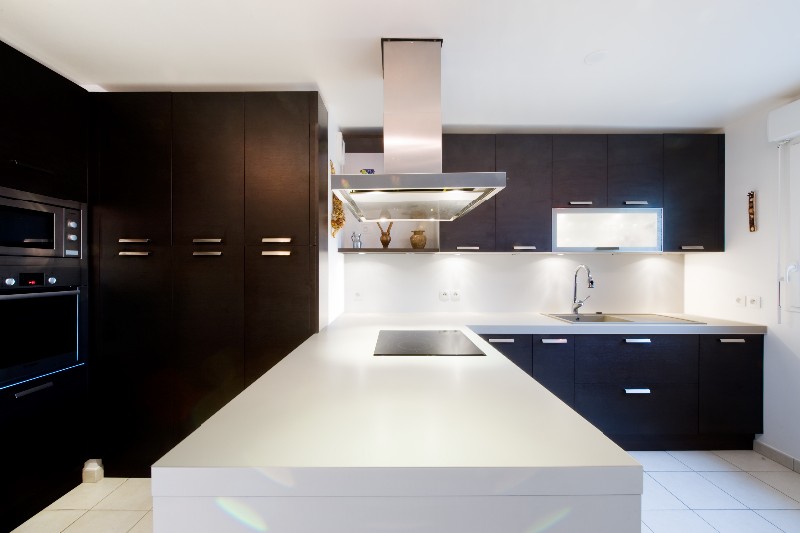Cuisine ARMONY design sur mesure modèle Kappa finition bois wengé, avec plan de travail en résine CORIAN coloris Glacier White.
