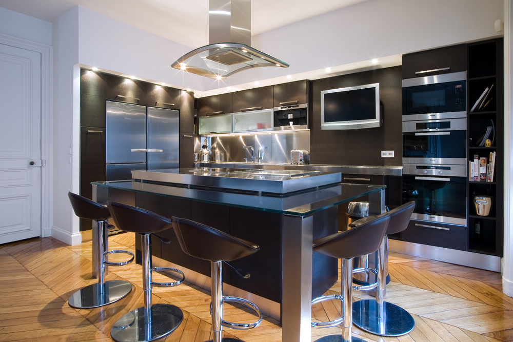 Le contraste du Wengé et de l’inox brossé est du plus bel effet dans cette cuisine japonisante et moderne. L’îlot central permet de cuisiner directement pour vos invités grâce au Teppanyaki intégré au centre. Le plan snack en verre trempé peut accueillir jusqu’à 5 personnes tout autour. A vous la cuisine japonaise !