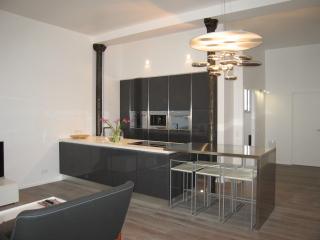 La cuve de l’évier est thermoformée dans le plan de travail en Corian facilite l'entretien quotidien. Au dessus de la table de cuisson se trouve une hotte escamotable, système très pratique lorsque l’installation d’une hotte murale ou de plafond est impossible, tout en étant très esthétique. La table inox brossée connectée à l’îlot permet aux convives de resté à proximité de leur hôte.