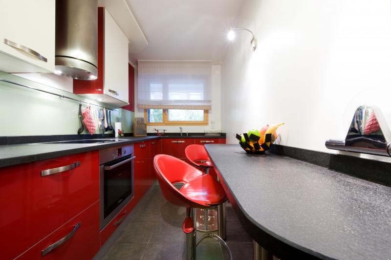 Cette cuisine en L bénéficie d’une large surface de travail avec un plan de travail en granit. La même matière été utilisée pour créer un coin repas surélevé très pratique. Le mobilier bas de cette cuisine est dans une finition rouge semi brillant, les façades des deux compartiments hauts sont en finition blanc mat. Les éclairage LED apportent un certain confort visuel et mettent en valeur la crédence en verre laqué.