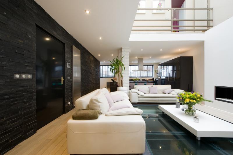 Dans ce grand appartement, la cuisine ouverte s’organise autour d’un ilôt central des plus élégants. Les nombreux rangements, à la fois dans le linéaire de meubles-colonnes et dans l’îlot rendent cette pièce très fonctionnelle. L’électroménager est également encastré pour plus d’unité et une grande pureté de lignes. L’ilôt central, équipé d’un plan snack en verre trempé valorisé par une bande LED, comprend une grande table de cuisson à induction et un teppanyaki (plaque de cuisson japonaise) pour cuire les aliments devant les convives attablés. Le design de cette cuisine s’accorde à la perfection avec l’environnement du loft dans laquelle elle est implantée.