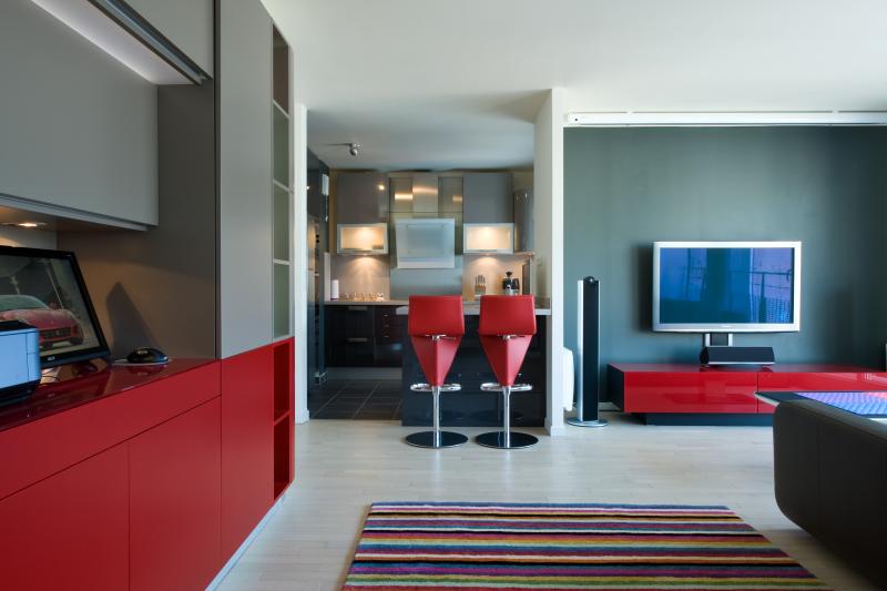 Cette cuisine en aménagement d’angle comporte à l’entrée un débordement du plan de travail pour prendre les repas. Les espaces de rangement sont calculés toute hauteur, avec intégration de bandeaux LED sous les meubles hauts et éclairage intérieur. Intégrés dans le plan de travail, on retrouve une plaque à induction ainsi qu’un tepan-yaki. Un bloc-prise d’angle optimise enfin l’utilisation du petit électroménager.