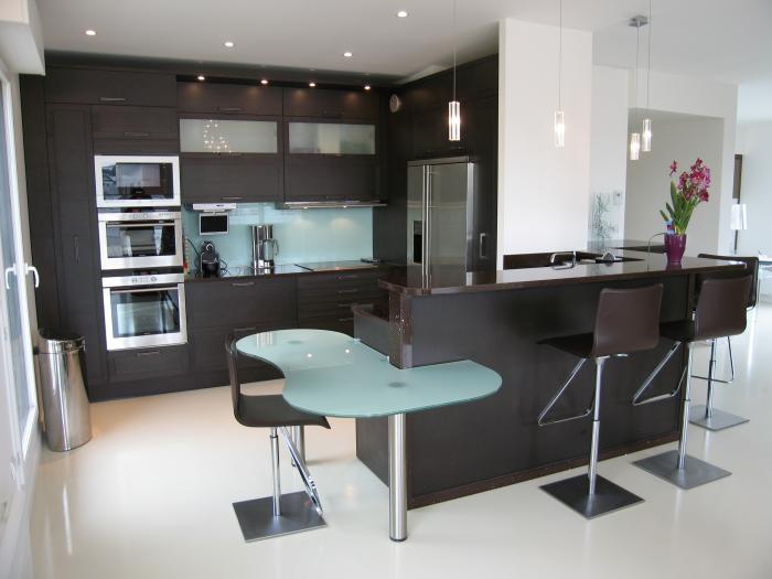 Cuisine ouverte, en placage chêne foncé et plan de travail en pierre de synthèse marron. Le mur équipé et destiné à la cuisson comprend four, four vapeur, micro-ondes et plaque de cuisson. Sous les meubles hauts a été installé un écran interactif permettant de regarder des émissions ou bien d’afficher des recettes. Un grand bar avec meubles de rangement et évier créer un lien avec le salon. Sur cet élément se rajoute un plan repas dessiné sur-mesure en verre, ainsi qu’une cave à vin.