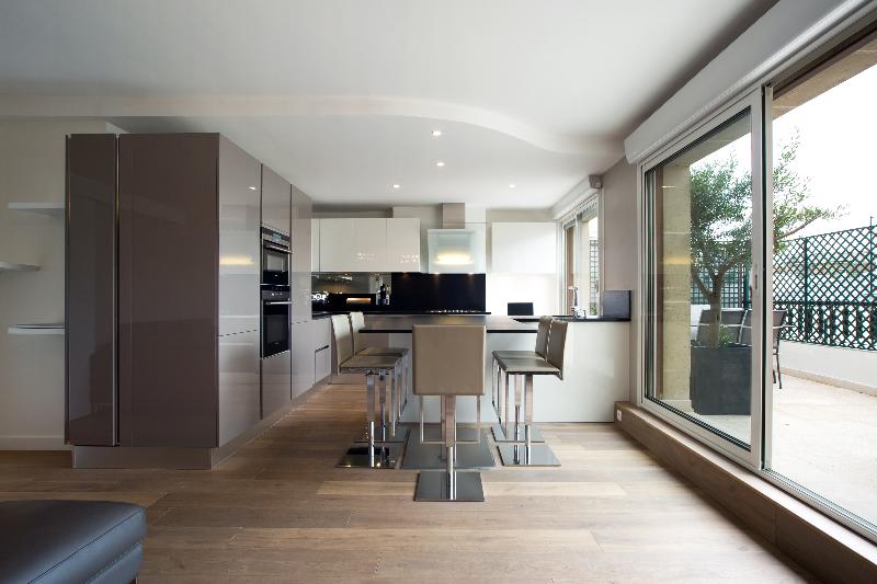 Cette cuisine agencée en L joue sur les teintes Corde et Blanc. Elle est équipée d'un îlot avec plan de travail en granit brossé flamé. Celui-ci se prolonge en L, supporté par deux pieds en aluminium, et fait office de table à manger.