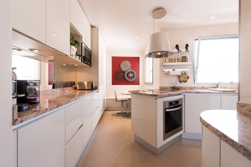 L’îlot concentrant plan de travail et plan de cuisson est disposé « en épi », au centre de la pièce.